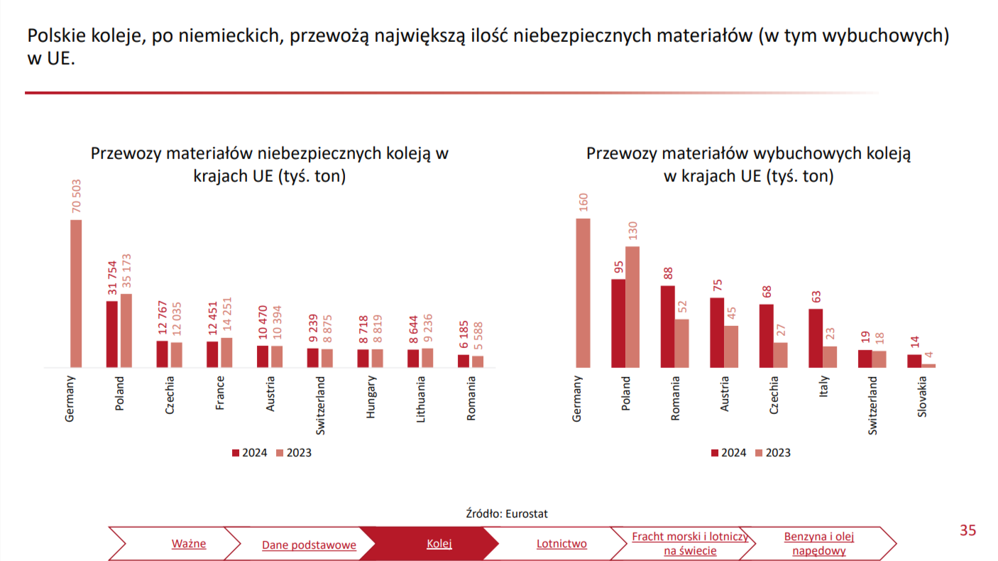 w przypadku materiałów niebezpiecznych łącznie w 2024 polskie koleje przewiozły ich 31754 tys. ton, zaś druga w zestawieniu Francja 12451 tys. ton (brak danych dla Niemiec za 2024, w 2023 było to 70503 tys. ton)