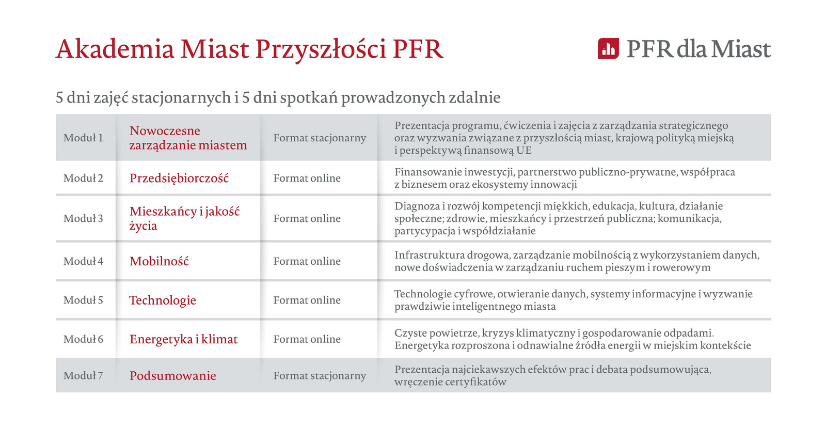"Pandemia Covid-19 wymusza na polskich samorządach przejście przyspieszonego kursu wdrażania innowacji. Dla wielu z nich to szansa na sprawne wykorzystanie istniejących możliwości i dokonanie kluczowych inwestycji, które mogą przyczynić się do rozwoju lokalnej przedsiębiorczości, utworzenia nowych miejsc pracy czy zatrzymania młodych talentów. Każda długofalowa zmiana wymaga jednak odpowiedniej wiedzy, dlatego stworzyliśmy Akademię Miast Przyszłości PFR – program, który wyposaży samorządowców ze średniej wielkości miast w umiejętności niezbędne do inicjowania i kompleksowej obsługi innowacyjnych projektów"